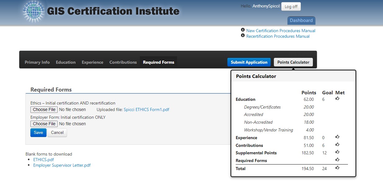 After all three components have been completed, the web application will total the points from each section and show in the Total Certification Points. If the final total does not exceed 150 points the 'Submit' button will not appear. When the site has determined that all point requirements have been met, a blue Submit Application button will appear, and, at that point, the applicant can submit the portfolio for official review.