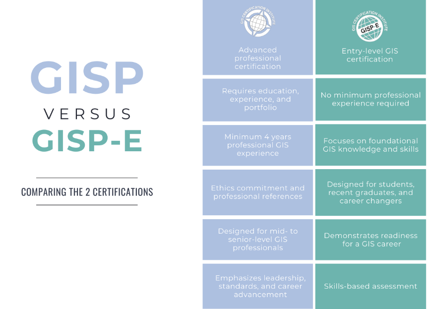 The diagram below shows the simplified pathways for becoming an Emerging GIS Professional (GISP-E) or a GIS Professional (GISP®).