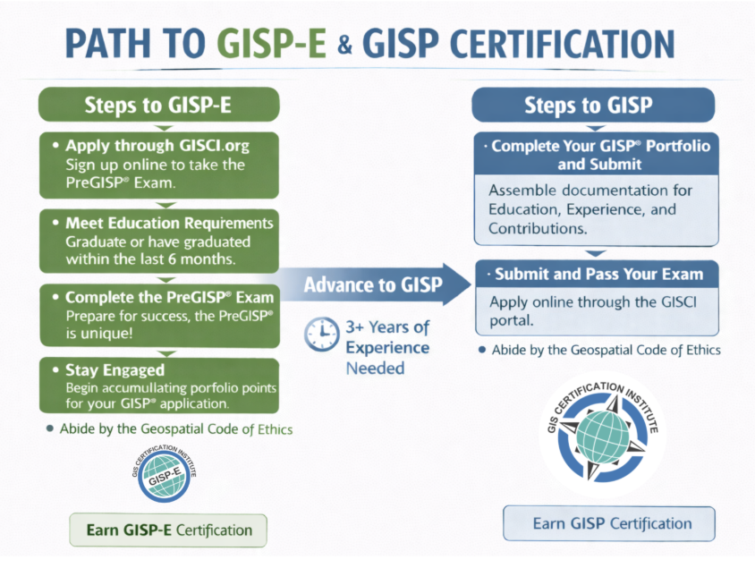 Becoming a GIS Professional (GISP®) through the GIS Certification Institute (GISCI) is a key milestone in your geospatial career. The GISP® credential recognizes your education, professional experience, contributions to the profession, and core technical knowledge — along with your commitment to ethical practice.